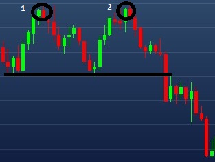 Por exemplo, na imagem abaixo temos uma forte barra verde (1) seguida por diversas barras laterais, encaixotadas numa figura de um quadrado. Um analista técnico pode presumir que estas barras encaixotadas seja uma correção depois de uma forte barra. Quando ocorre o rompimento com a segunda forte barra verde (2), presume-se que houve um rompimento da lateralidade anterior e este mercado tem uma grande probabilidade continuar subindo. Isso porque quando ocorre essa situação, o mercado mais vezes continua fazendo o movimento de subida do que de reversão (para baixo).